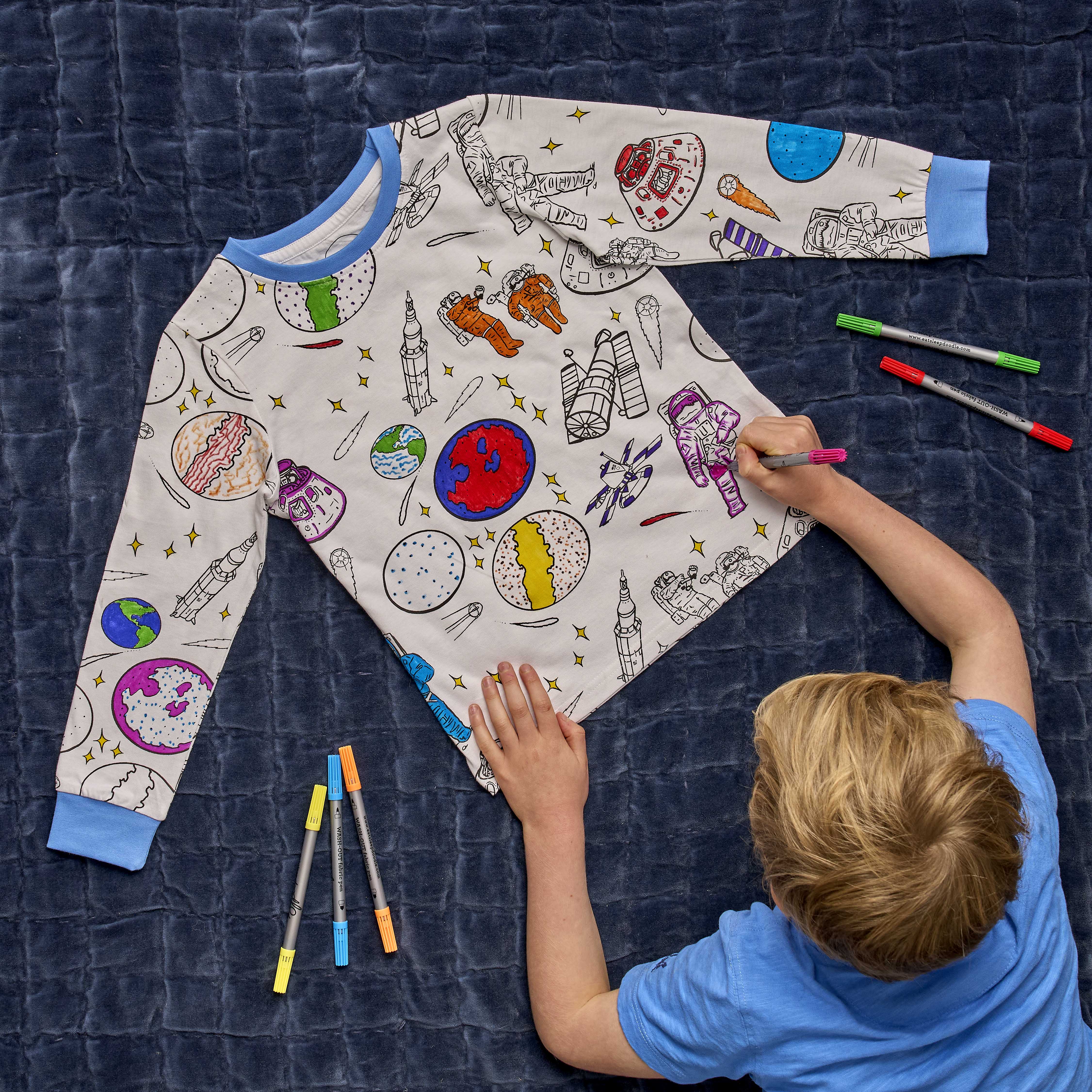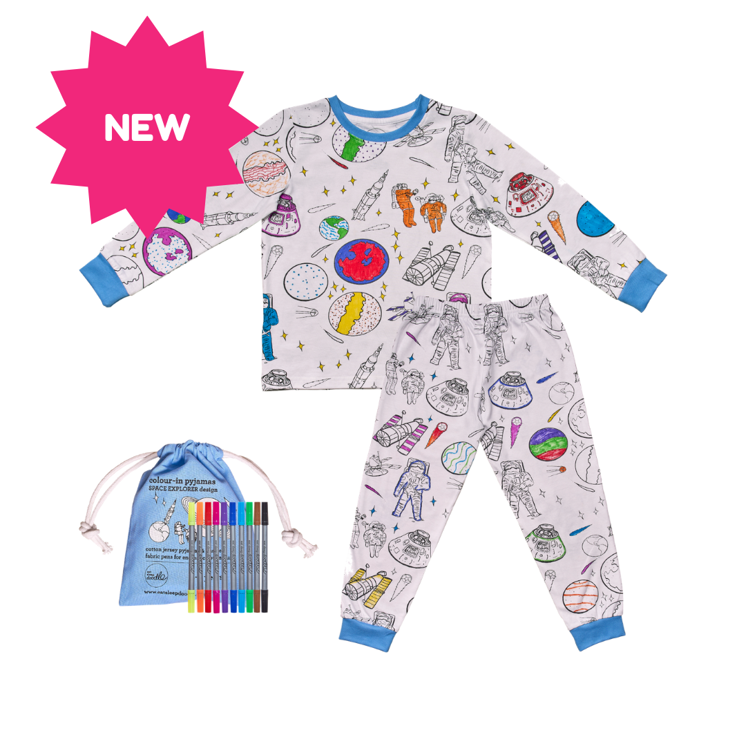 Step back in time for an adventure with our color in space explorer pajamas – complete with a set of super wash out fabric markers!