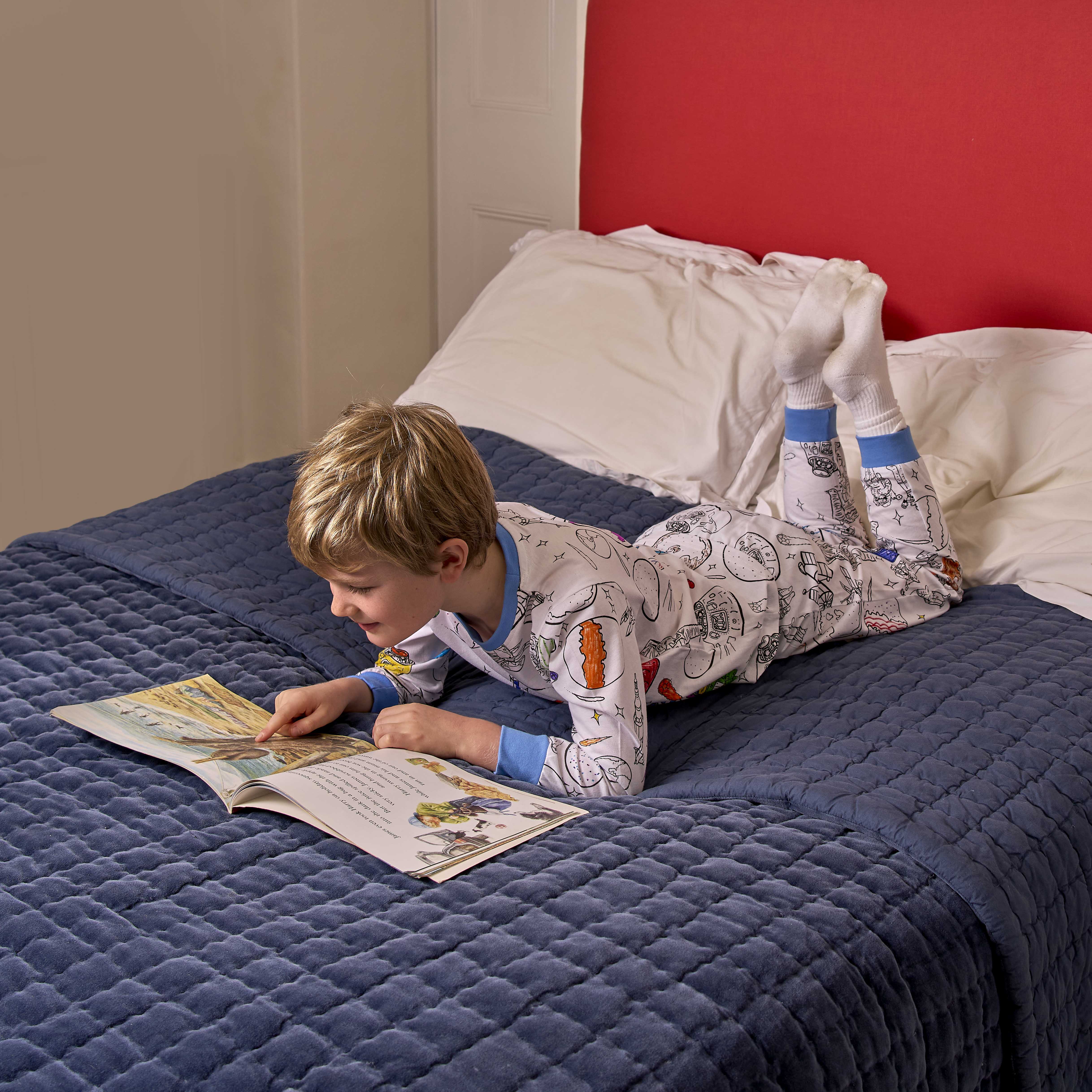 You can use our chart below to find the right size pyjamas for your little one! Please note the chart below is for body size and not garment size. See our full size guide for advice on how best to measure your child for our color-in pyjamas.
